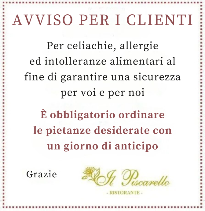 Avrete la possibilità di respirare di persona l’elegante atmosfera del ristorante Il Piscarello e, soprattutto, iniziare a farvi travolgere dal gusto e dai sapori che da 30 anni serviamo a regola d’arte.